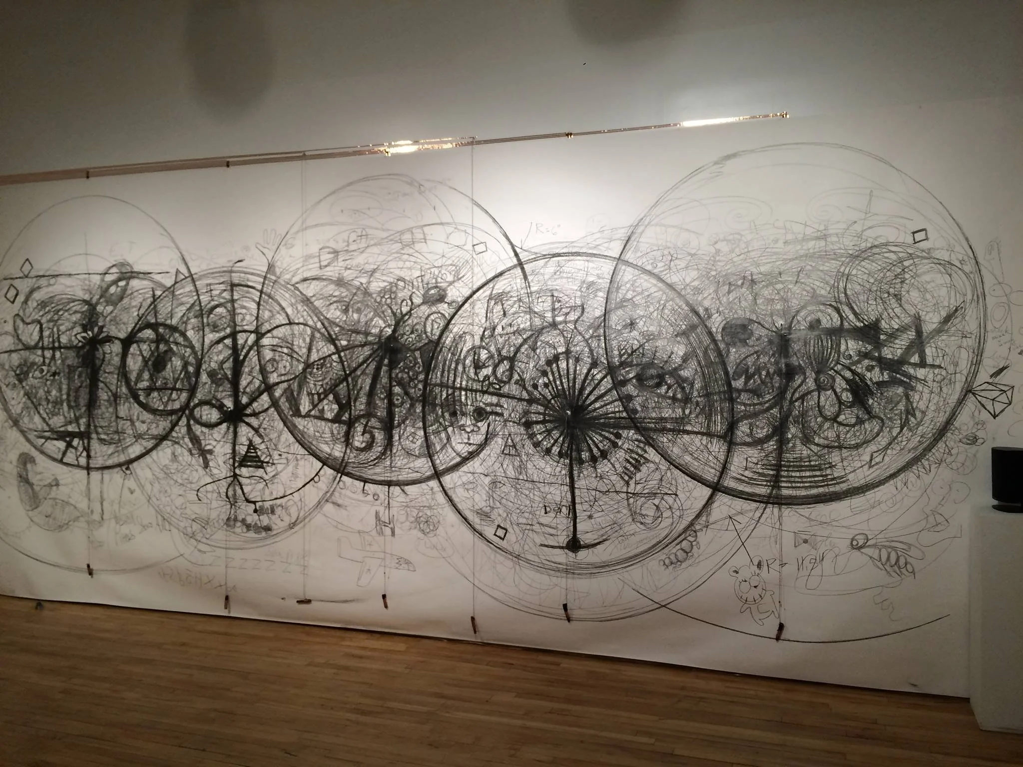 This installation is based on analog current flowing in a closed circuit to trigger digital sound. The current travels through graphite lines, acting as wires, to an Arduino micro-controller, which then converts this analog voltage to serial data that the computer can interpret. Digital sounds stored on the computer are triggered when the computer receives this serial information. These triggered digital sounds are then converted back to analog and sent out through speakers, creating vibrations that our ears pick up and hear as sound. This analog-to-digital conversion emulates how our ears and brain receive signals and interpret sound. The ear receives vibrations in the form of analog sound waves and converts these vibrations to electrical currents, which our brain interprets as sound.